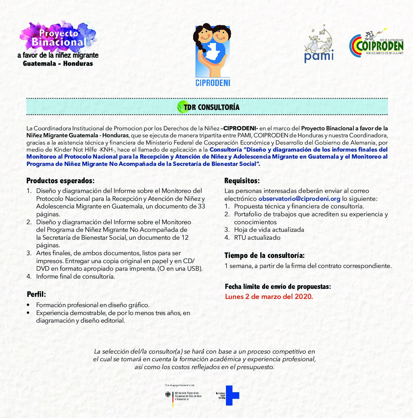 Consultoría “Diseño y diagramación de los informes finales del Monitoreo al Protocolo Nacional para la Recepción y Atención de Niñez y Adolescencia Migrante en Guatemala y el Monitoreo al Programa de Niñez Migrante No Acompañada de la Secretaría de Bienestar Social”.