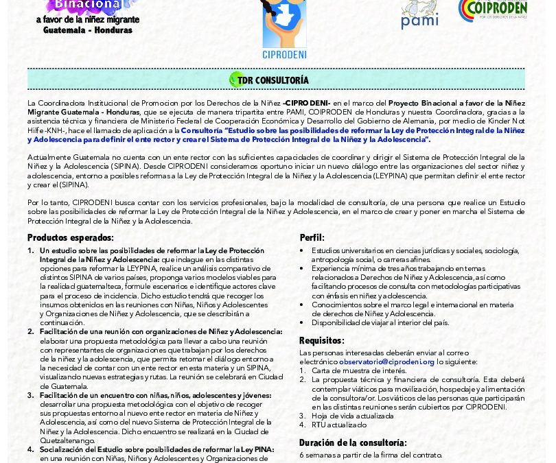 TDR-Consultoría “Estudio sobre las posibilidades de reformar la Ley de Protección Integral de la Niñez y Adolescencia para definir el ente rector y crear el Sistema de Protección Integral de la Niñez y la Adolescencia”.