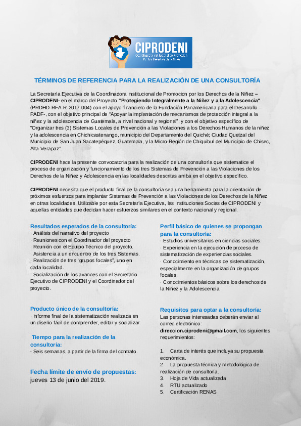 TDR-Consultoría “Estudio sobre las posibilidades de reformar la Ley de Protección Integral de la Niñez y Adolescencia para definir el ente rector y crear el Sistema de Protección Integral de la Niñez y la Adolescencia”.
