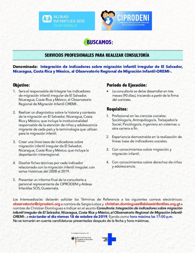 Consultoría “Diseño y diagramación de los informes finales del Monitoreo al Protocolo Nacional para la Recepción y Atención de Niñez y Adolescencia Migrante en Guatemala y el Monitoreo al Programa de Niñez Migrante No Acompañada de la Secretaría de Bienestar Social”.