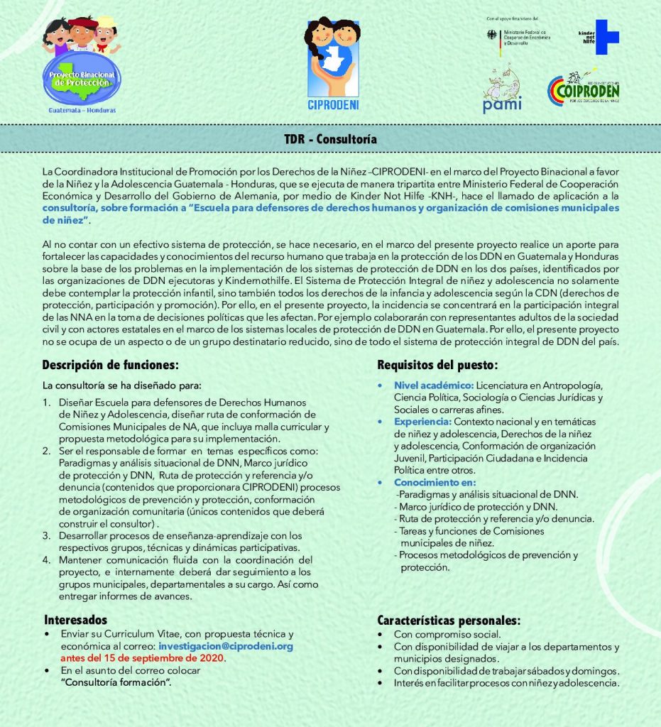 TDR-Consultoría: “Escuela para defensores de derechos humanos y organización de comisiones municipales de niñez”.